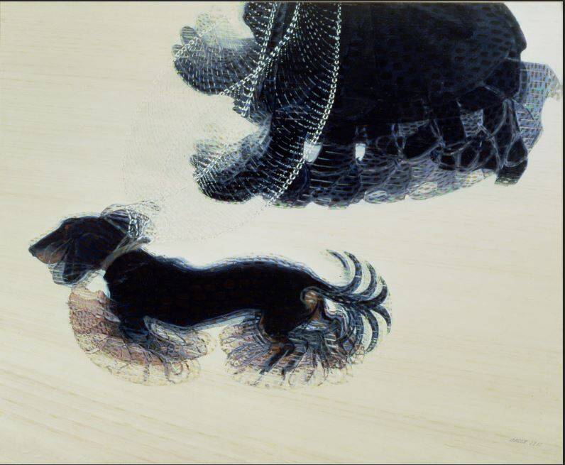 Raffigurando in un'unica immagine il continuo spostamento della testa, delle zampe e della coda del cane, insieme al movimento del guinzaglio, al passo e al fluire dell'abito lungo della padrona. Ecco perché anche se nel quadro vediamo una padrona con tanti piedi, tante catene e un cane con tante teste, piedi e code ci appare straordinariamente vero, corretto.